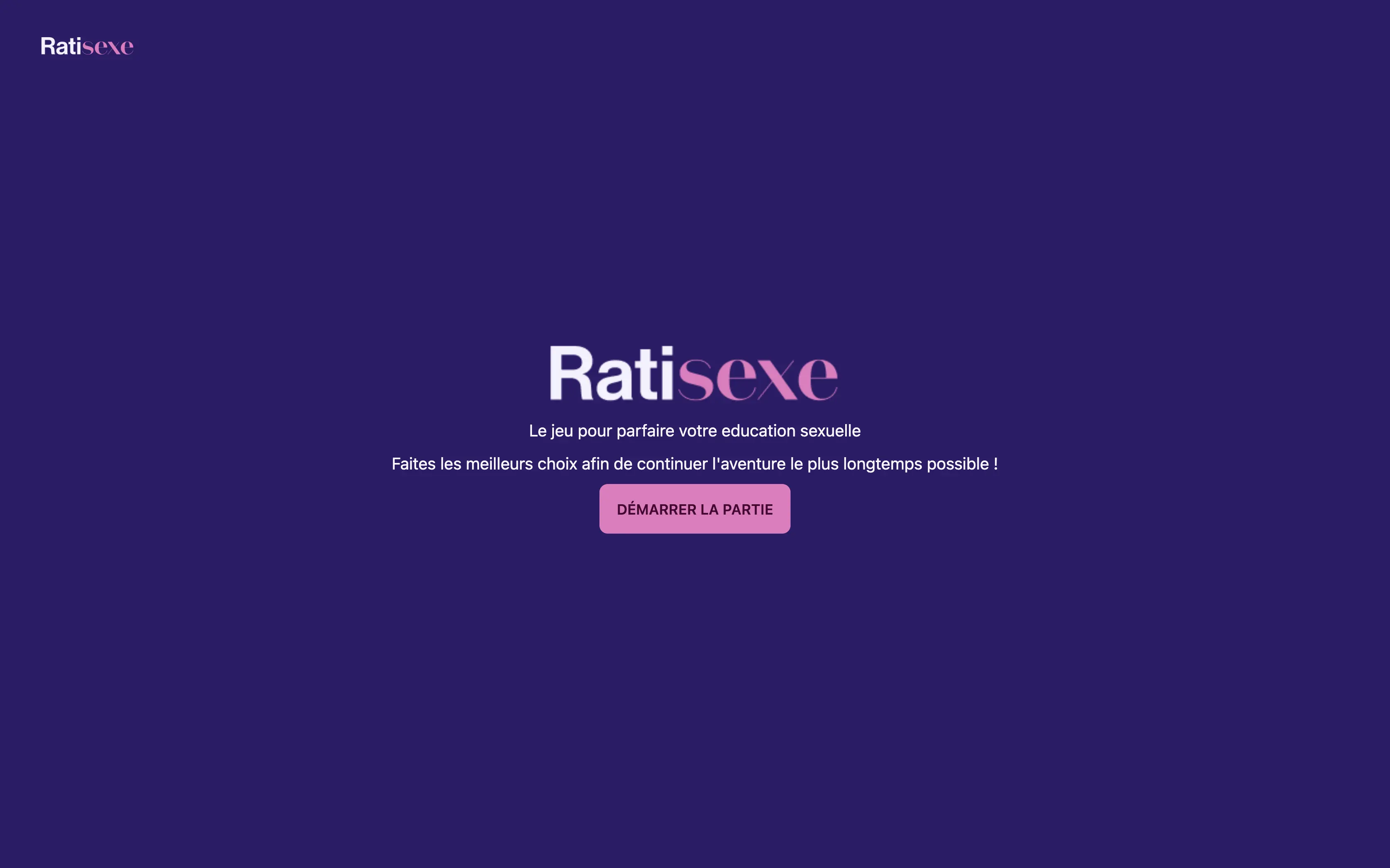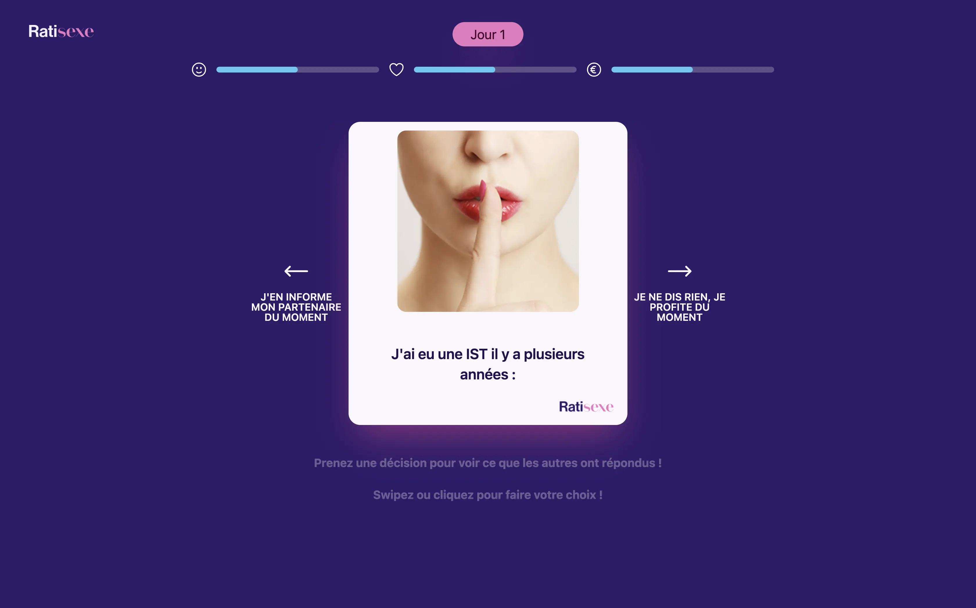 C'est avec cette idée en tête que nous avons créé Ratisexe. Chaque jour, le joueur va devoir faire un choix qui va l'impacter sur sa santé, son plaisir sexuel et sur ses finances.